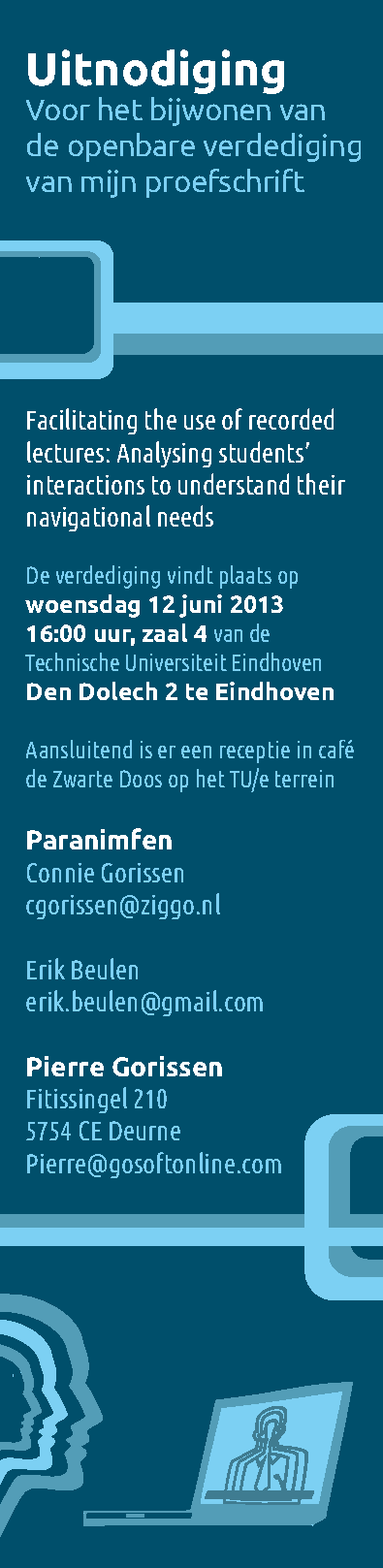 - Gorissen, P. (2010) Meten is weten: wat doen studenten met opnames van colleges? [To measure is to know: what do students do with recordings of lectures?]. Presentation at the Educational Days, Utrecht, the Netherlands